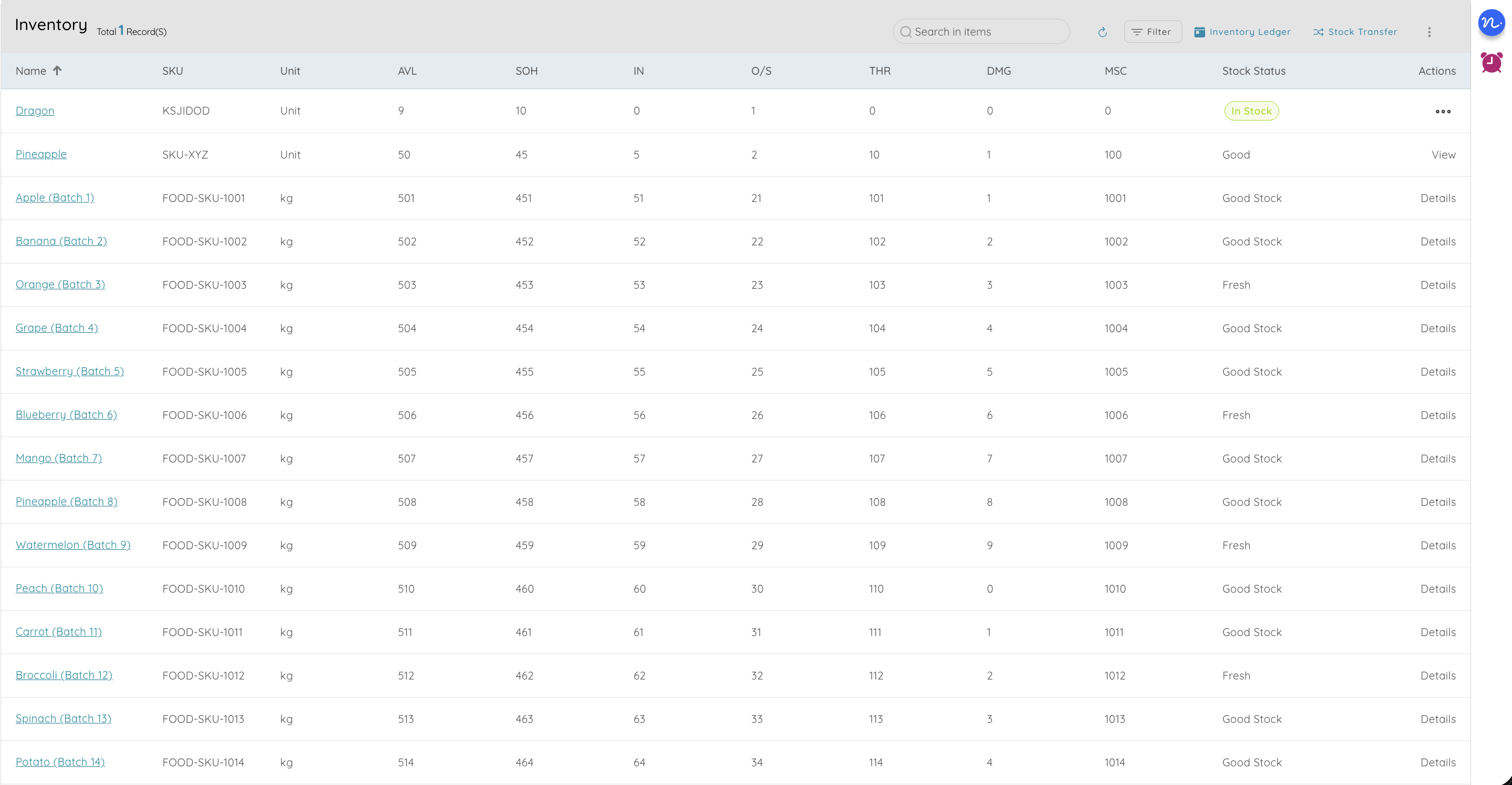 You can instantly monitor key inventory indicators such as Available Stock (AVL), Stock on Hand (SOH), Incoming Stock (IN), Outgoing Stock (O/S), Threshold Levels (THR), and overall Stock Status. These indicators help you understand current stock health and plan inventory actions proactively.