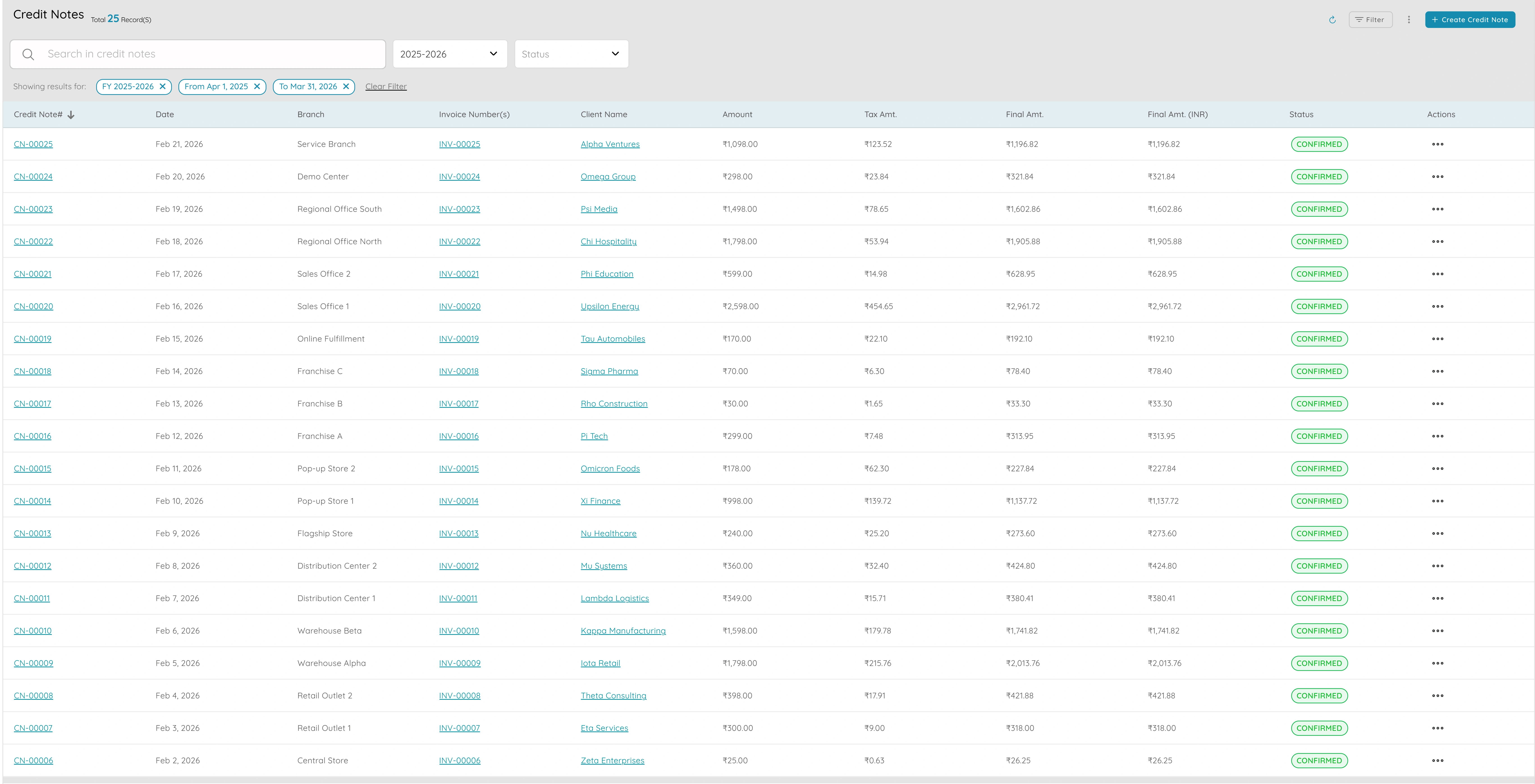 - Client ledger shows all invoices, payments, credit notes, and debit notes